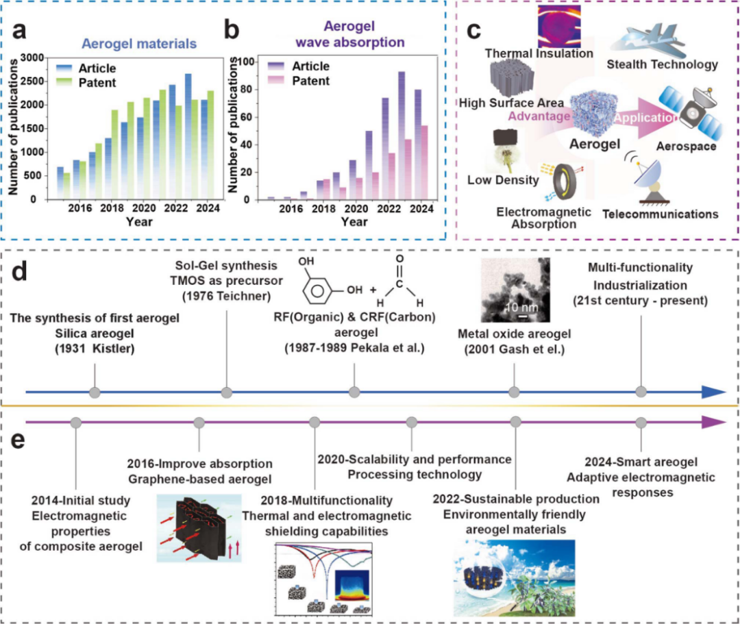 (a,b)近年来(2015-2024)发表的论文和专利数量,包括(a)气凝胶材料和(b)电磁波吸收气凝胶材料的发展状况;(c)气凝胶材料的优势(左侧)和应用领域(右侧);(d)气凝胶材料的发展历程时间线。(e)气凝胶材料在电磁波吸收领域应用的时间线。