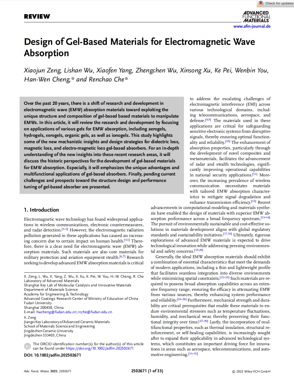 【校园网讯】近日,我校材料科学与工程学院曾小军副教授在电磁功能材料领域取得重要进展,其以第一作者身份联合复旦大学车仁超教授团队,在国际顶级期刊《Advanced Functional Materials》(中科院1区Top,IF=18.5,CiteScore:29.5)发表综述论文《Design of Gel-Based Materials for Electromagnetic Wave Absorption》。
