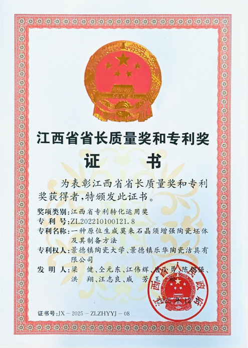 在“双碳”背景下,陶瓷行业的节能减排势在必行,其中,坯体减薄最为有效。然而,陶瓷坯体减薄通常会引起强度下降,导致产品合格率降低,成为制约该技术实现产业化的关键共性难题。梁健正高级工程师团队的获奖专利,突破了陶瓷行业 “减薄” 与 “增强” 难以兼顾的关键技术瓶颈,通过原位生成莫来石晶须增强,在陶瓷坯体内构筑三维网络骨架,实现了三大核心突破:一是性能突破,产品抗折强度≥110MPa,较传统产品提升 50% 以上;二是节能降耗实现坯体减薄1/3,综合能耗降低约18%,原料消耗降低30%;三是绿色低碳,将烧成温度降低至1150-1200℃,碳排放减少14.3%。该成果拥有6项相关发明专利授权,已在景德镇乐华陶瓷洁具有限公司成功实现规模化生产,为陶瓷行业转型升级提供了可复制、可推广的技术方案。该成果的实施有利于服务我省“1269”行动计划(建材产业链),推动传统陶瓷行业转型升级,绿色低碳高质量发展,经济社会效益显著。
